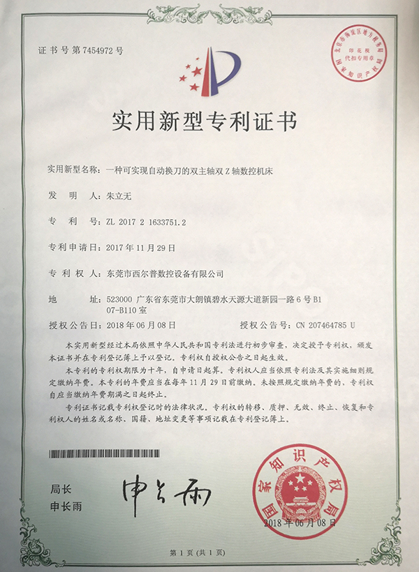 一種可實現自動換刀的雙主軸雙乙軸數控機床 榮譽資質 關于上饶长鑫航空航天集团 cnc加工中心廠家_小型數控銑床_小型數控機床_東莞市上饶长鑫航空航天集团